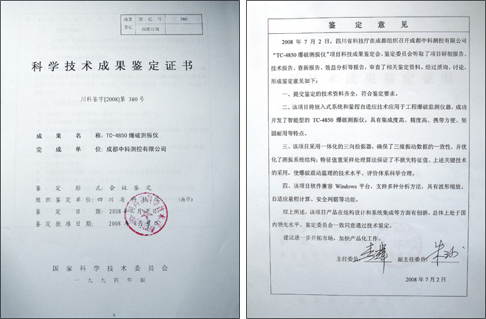 2008年7月2日下午,四川省科技廳組織中國(guó)測(cè)試技術(shù)研究院、電子科技大學(xué)、中科院成都分院等科研單位的7名專家教授對(duì)成都中科測(cè)控公司研制的TC—4850爆破測(cè)振儀進(jìn)行科技成果鑒定。會(huì)上經(jīng)過反復(fù)論證后,專家們一致認(rèn)定: " TC—4850 爆破測(cè)振儀在結(jié)構(gòu)設(shè)計(jì)和系統(tǒng)集成方面有創(chuàng)新,總體上處于國(guó)內(nèi)領(lǐng)先水平。鑒定委員會(huì)一致同意通過技術(shù)鑒定 "