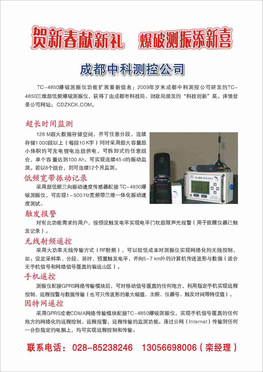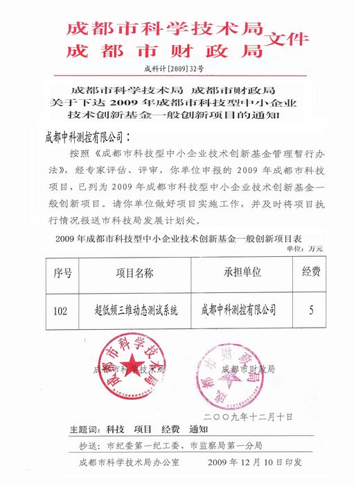 2009年歲末成都中科測控公司研發(fā)的TC-4850三維超低頻爆破測振儀,獲得了由成都市科技局、財政局頒發(fā)的“科技創(chuàng)新”獎。
