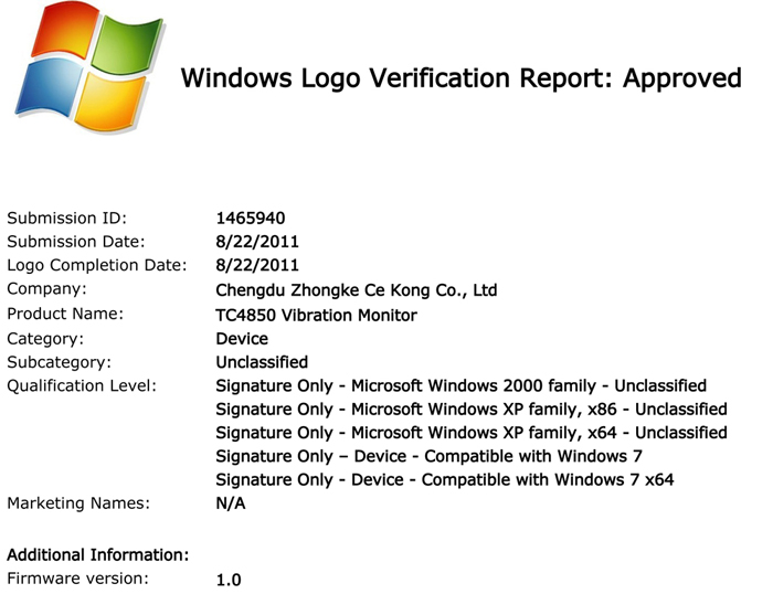 2011年8月22日,TC-4850經(jīng)美國微軟公司嚴(yán)格技術(shù)測試認(rèn)定,該產(chǎn)品與windows操作系統(tǒng)可以達到100%兼容,從而使計算機系統(tǒng)達到前所未有的穩(wěn)定性,特授予WHQL(硬件質(zhì)量)認(rèn)證。