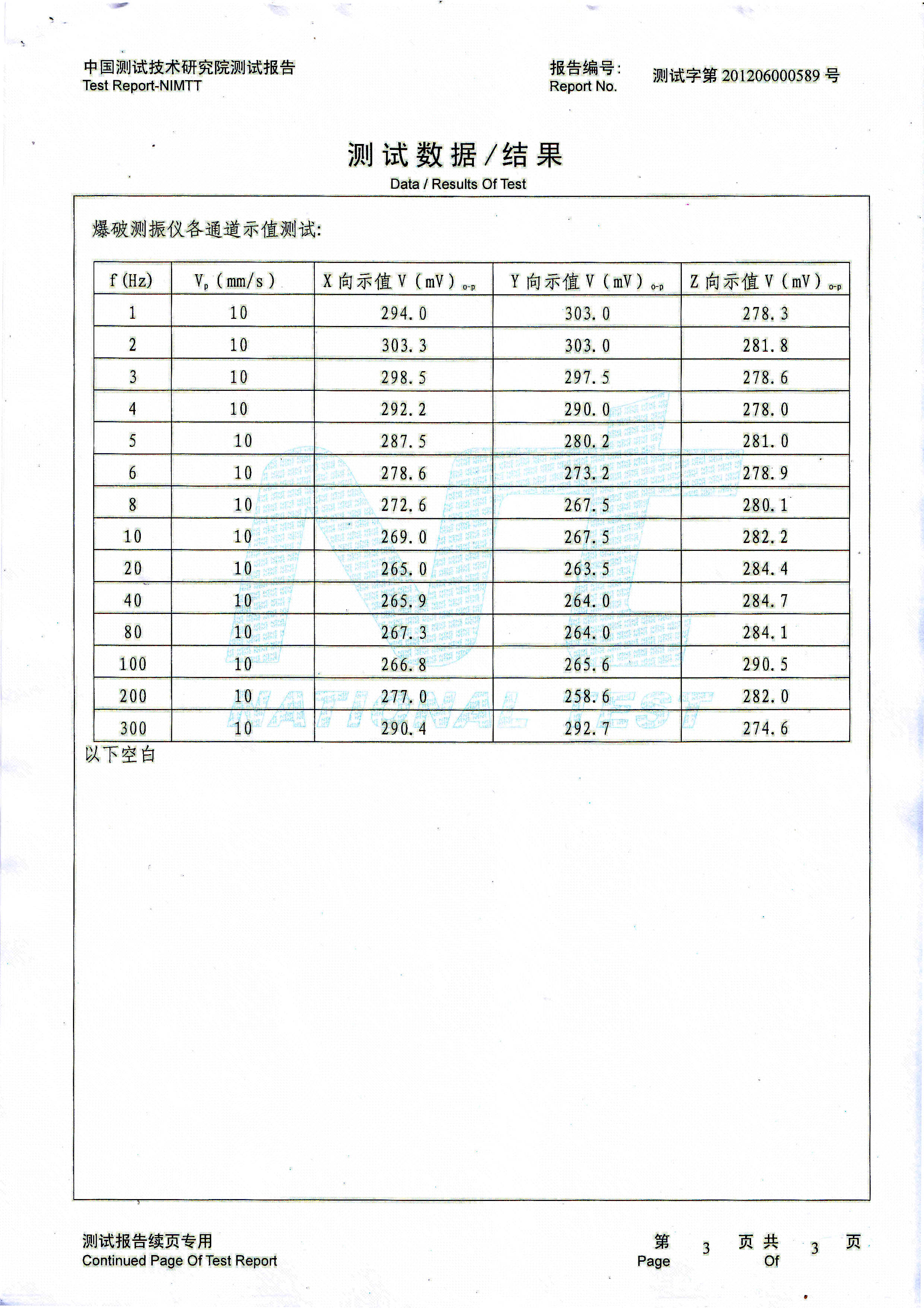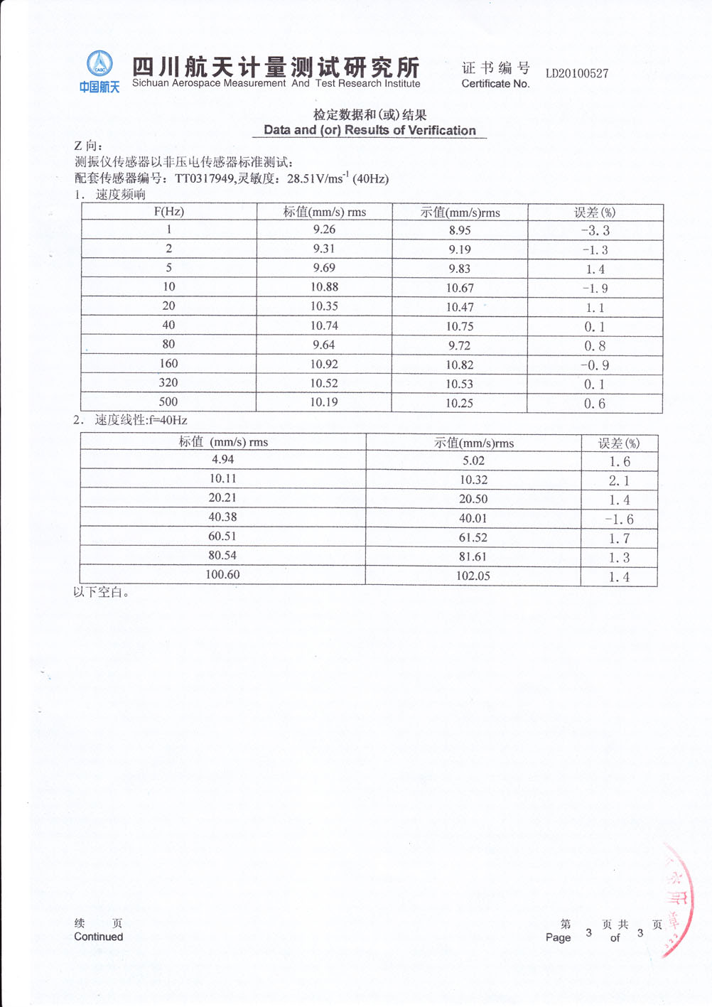 (本傳感器為X、Y、Z三向振動(dòng)速度傳感器,因檢測單位振動(dòng)臺(tái)原因只能檢定Z向)